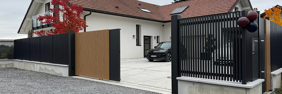 - Fluidité des accès : Le portillon coordonné assure un accueil piéton élégant, tandis que le large portail coulissant motorisé optimise l'espace de manœuvre pour les véhicules de particuliers.