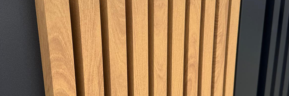 Cet ensemble portail - portillon - clôture tire sa force visuelle d'un dialogue entre les différentes finitions. La sobriété de l’aluminium laqué gris anthracite se marie à la perfection avec la chaleur des tasseaux imitation bois. Le veinage délicat des profils effet chêne vient adoucir la force brute du métal, offrant un rendu à la fois moderne et organique.